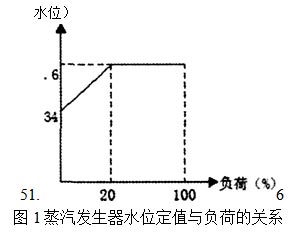 主給水泵的打出來的水經(jīng)過高壓加熱器后進(jìn)人一條給水母管,再由此分為兩條給水管路,通往兩臺蒸發(fā)器。每個給水調(diào)節(jié)站包括一個主給水調(diào)節(jié)閥和一個旁路調(diào)節(jié)閥,在主調(diào)節(jié)閥前后設(shè)電動隔離閥,每臺蒸汽發(fā)生器裝有一個水位控制器,用于使蒸汽發(fā)生器保持一個隨負(fù)荷變化的預(yù)定水位。并聯(lián)安裝的主、旁路調(diào)節(jié)閥進(jìn)行給水流量調(diào)節(jié),以調(diào)節(jié)蒸發(fā)器的水位。主給水調(diào)節(jié)閥可保證1854t/h的流量(名義流量的 95%),旁路調(diào)節(jié)閥可保證的流量為293(名義流量的巧%)。當(dāng)負(fù)荷小于18.5%Pn時,旁路調(diào)節(jié)閥獨(dú)自控制;當(dāng)負(fù)荷在1 &5%pn到100% pn之間時,主給水調(diào)節(jié)閥和旁路調(diào)節(jié)閥都參與SG水位控制,此時,旁路調(diào)節(jié)閥保持全開狀態(tài)。主給水調(diào)節(jié)閥和旁路調(diào)節(jié)閥可用電動閥從上游和下游進(jìn)行隔離。 圖1給出了蒸汽發(fā)生器水位定值與負(fù)荷的關(guān)系。在(蒸汽)負(fù)荷小于20%pn時,程序水位線性的從34%(零負(fù)荷時)變化到5L6%(在 20%pn時)。在負(fù)荷大于20%Pn時,程序水位是恒定的,并設(shè)定為窄量程水位的5L6%。